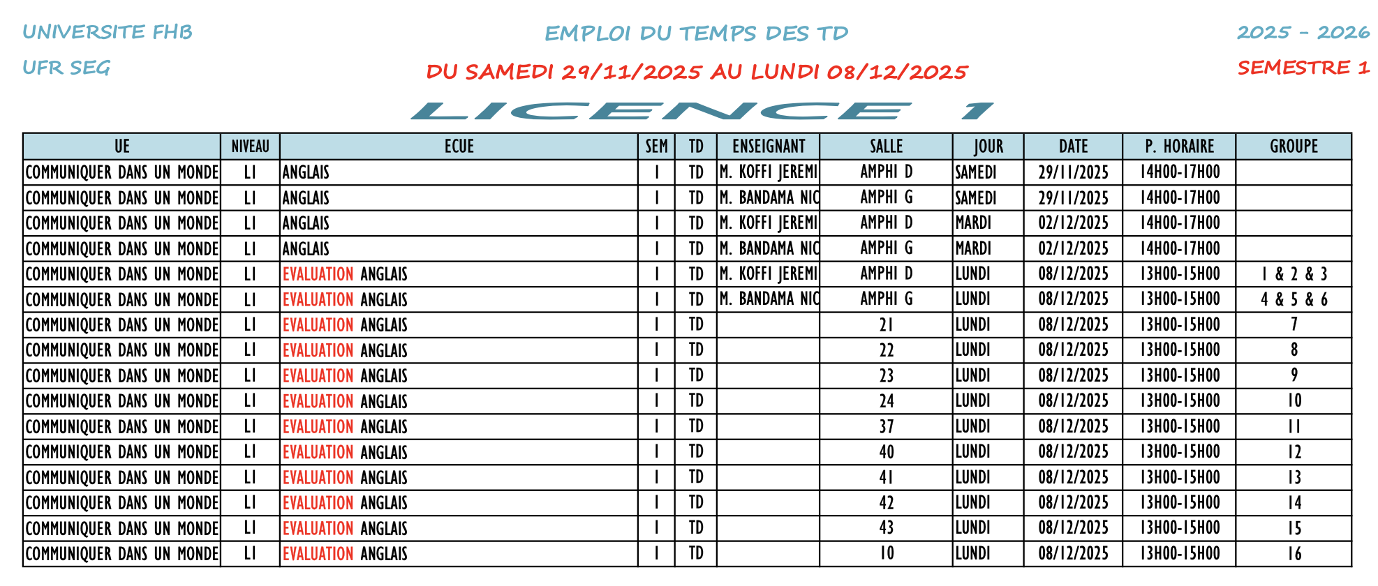 EMPLOI DU TEMPS DES TD DU SAMEDI 29/11/2025 AU LUNDI 08/12/2025