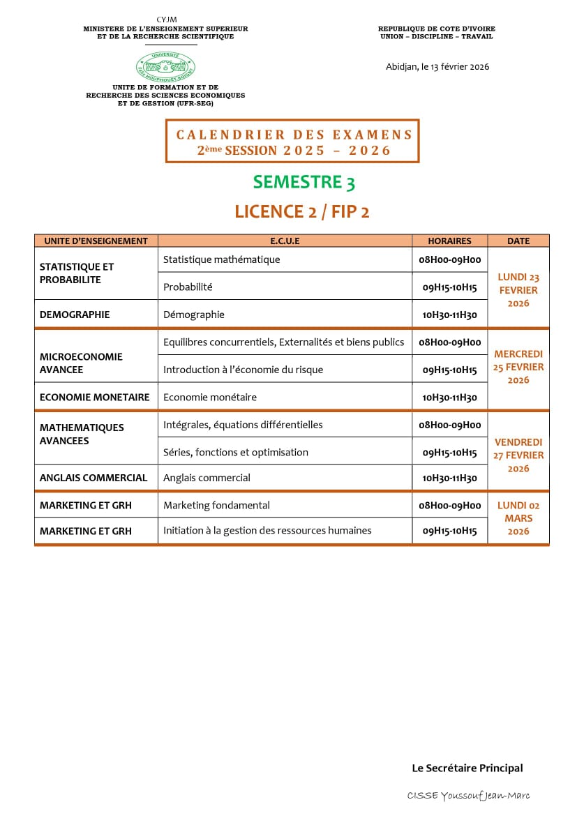 CALENDRIER DES EXAMENS DE 2eme SESSION L2/FIP2